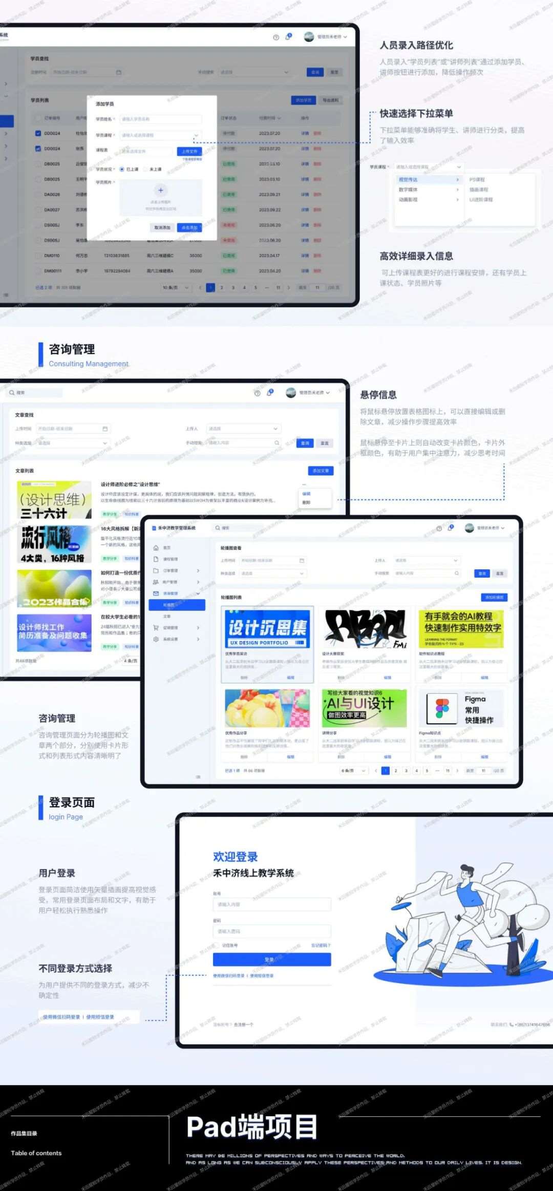 “刚开始准备作品集时,我一度有些迷茫,不知该选择哪些作品。在老师的建议下,我意识到应当尽可能涵盖多种设计类型,全面呈现自己的能力。最终我选择了在禾田培训期间完成的UI设计,以及学校比赛获奖的平面作品,类型覆盖了界面、海报和品牌设计等方面。我在每个项目中都完整呈现了设计流程,尽可能让面试官清晰看到我的思考路径。”