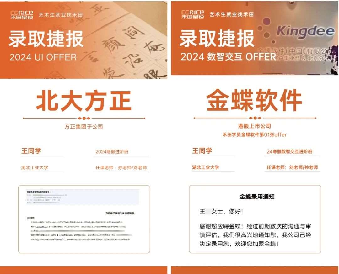 “大三下学期,我完成了第*版作品集并开始投递实习,很快便收到了北大方正的offer,在此度过了三个月的实习时光;大四上学期,我又顺利拿到金蝶的实习offer。这两段经历让我获益良多,也亲身体验了两种截然不同的职场氛围。”小王同学分享道。