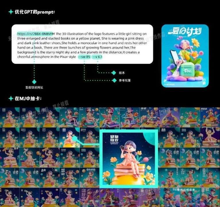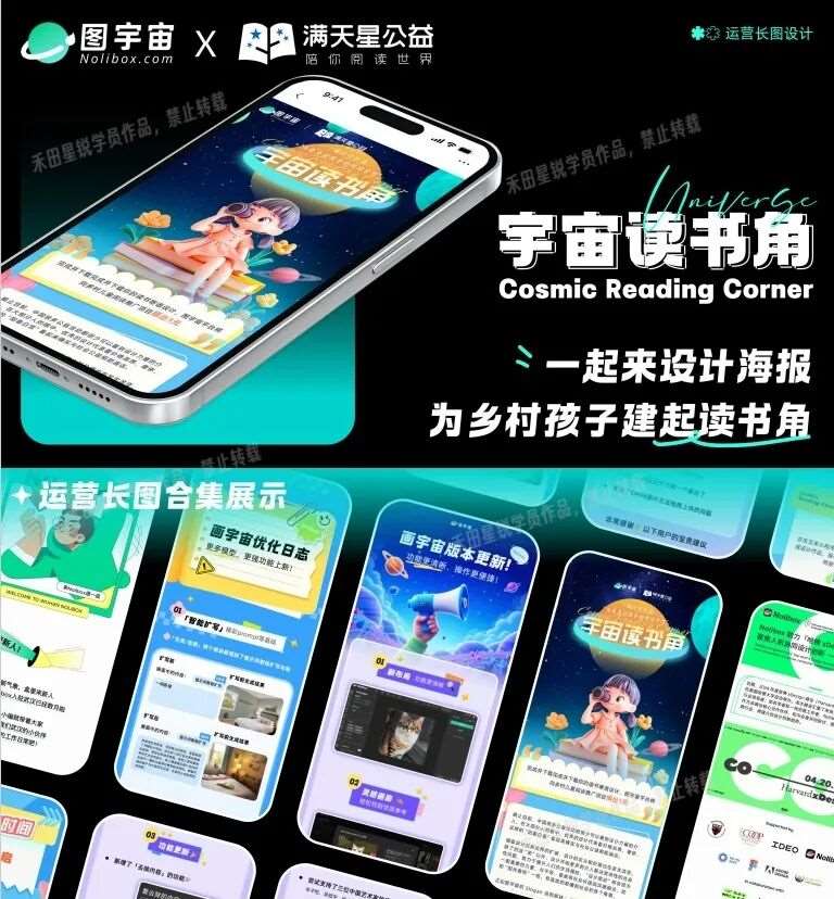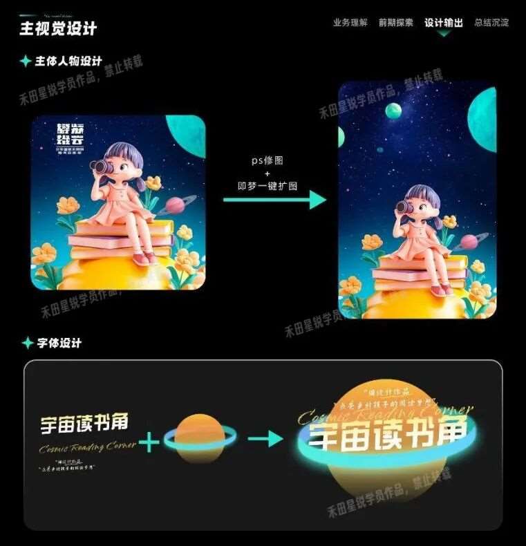 我的转折点来自在禾田班上学习AIGC课程。在课程的学习中,作品集的准备是一个循序渐进、水到渠成的过程。刚开始上课时,我们先跟着老师熟悉经典案例,临摹一些优秀设计来练手;然后进入实战练习阶段,根据老师布置的题目做出自己的版本;最后,老师让我们独立完成一个完整的项目和毕业作品。这样循序渐进的学习让我对AIGC工具的运用越来越顺畅,也摸索出了作品创作的技巧与模式。课程结束时,我已经产出了一批原创作品,可以说既涨了技能,又攒了作品。