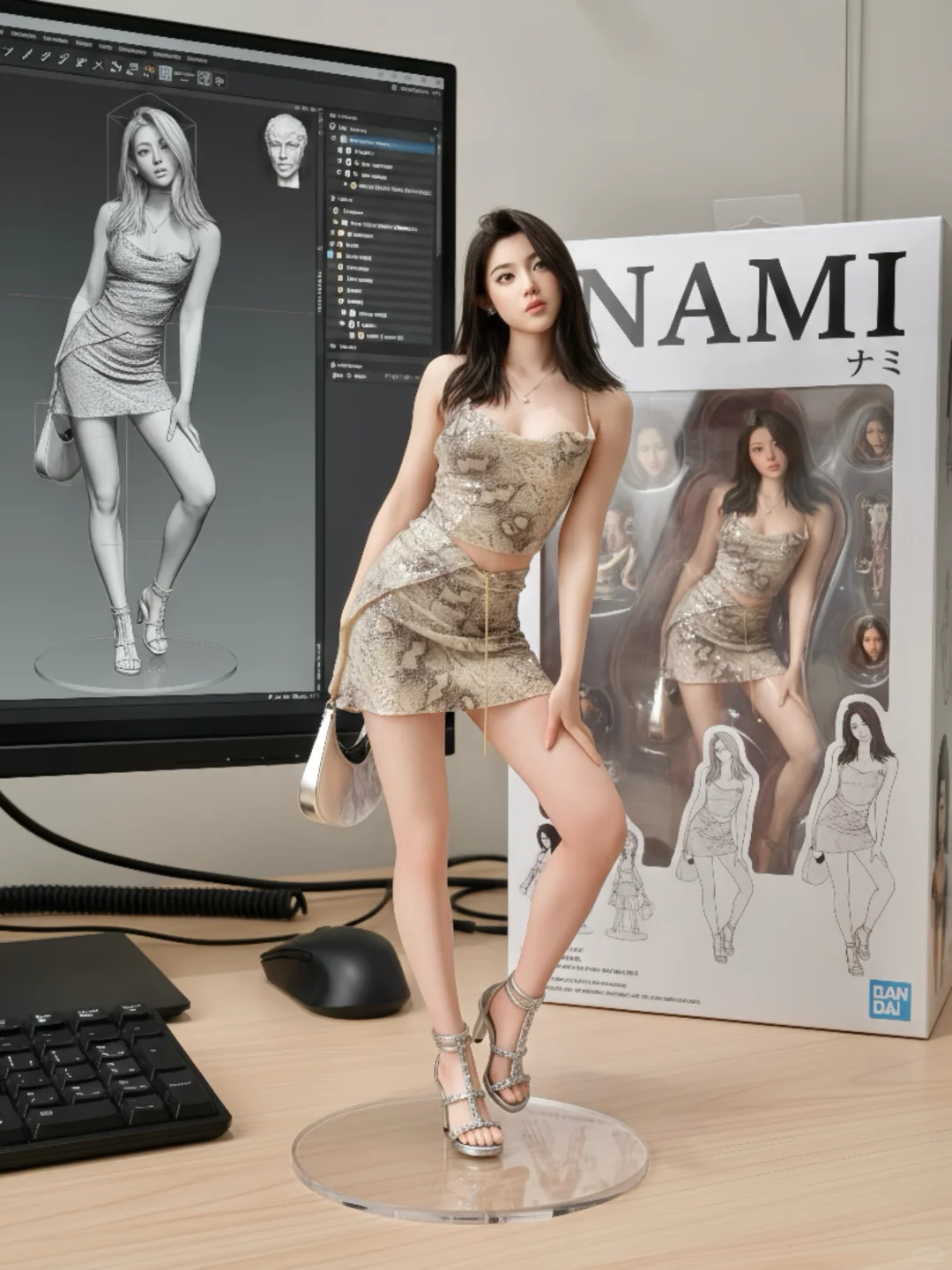 Use the nano-banana model to create a 1/7 scale commercialized figure of thecharacter in the illustration, in a realistic styie and environment.Place the figure on a computer desk, using a circular transparent acrylic base without any text.On the computer screen, display the ZBrush modeling process of the figure. Next to the computer screen, place a BANDAl-style toy packaging box printedwith the original artwork.